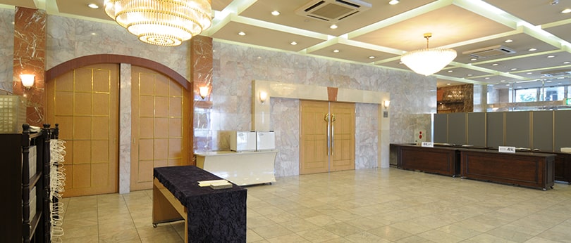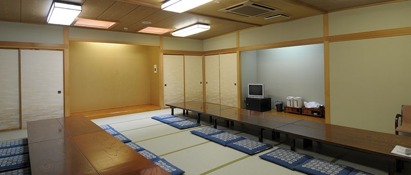 - 1階:式場(鳳凰)60人、1階:式場(富士)60人、3階:式場(甲斐)50人、1階:式場(鳳凰+富士)120人、階:食事室(信濃)100人、階:食事室(木曾)80人、階:食事室(信濃+木曾)180人